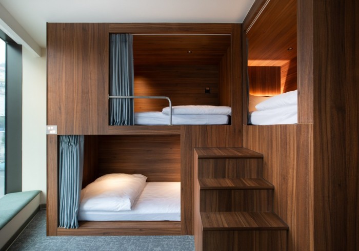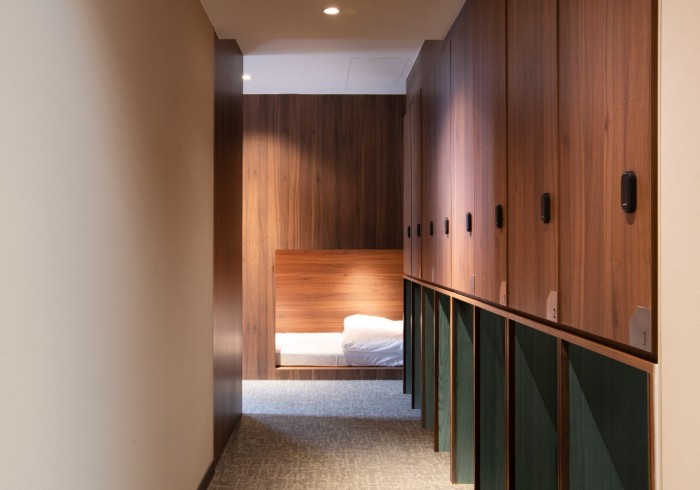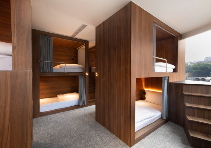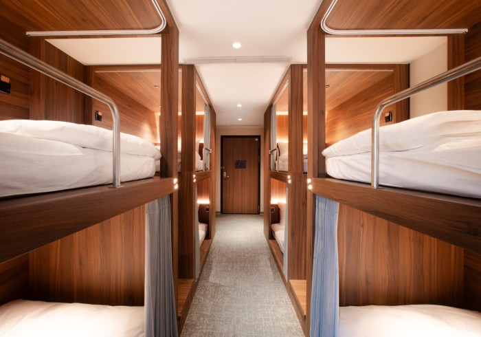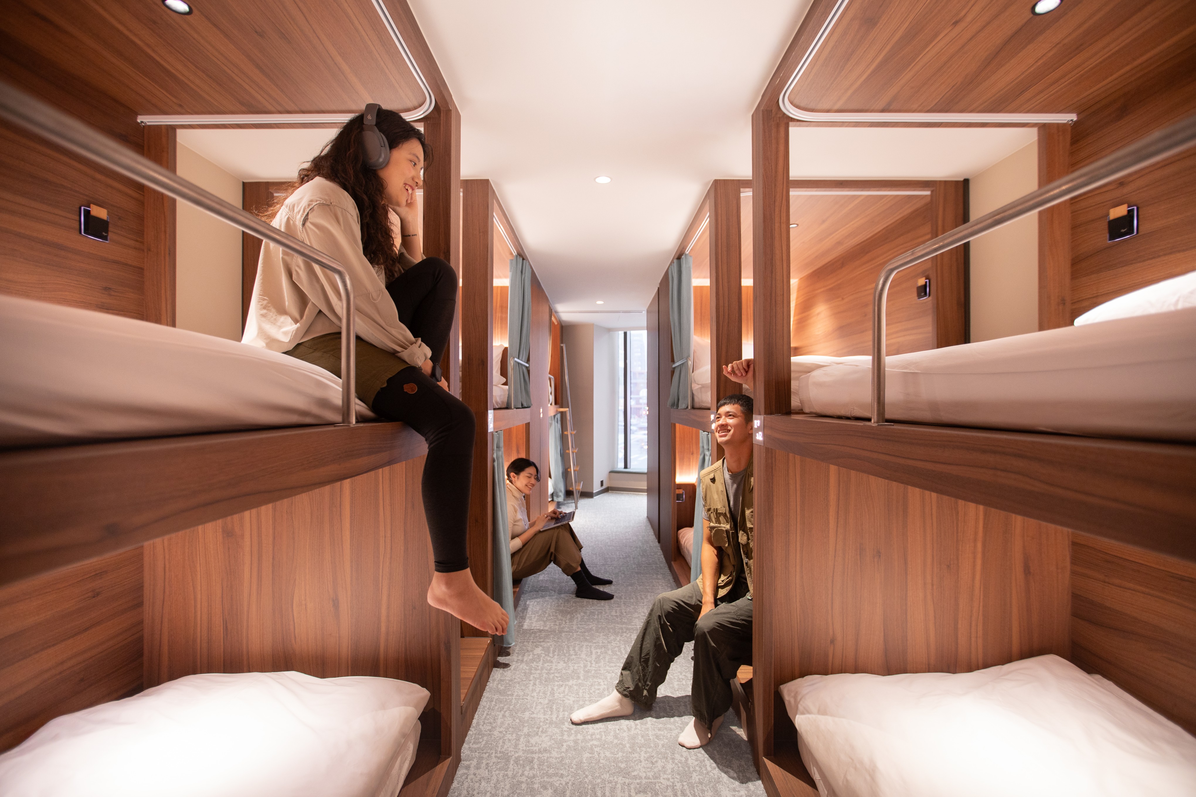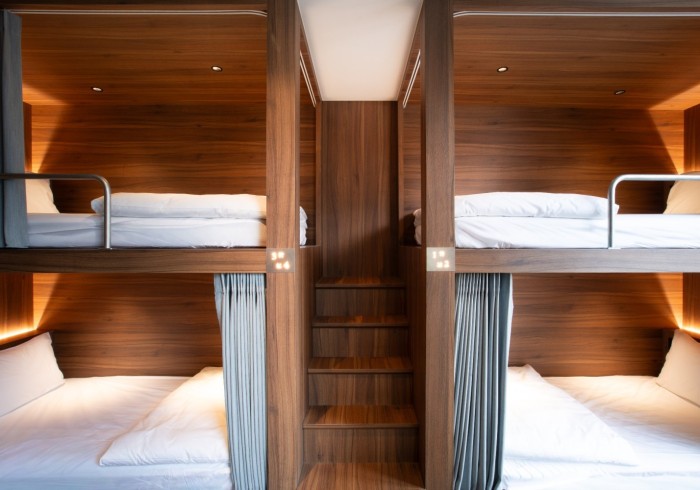 Each bed includes a privacy curtain, personal reading light, and individual locker